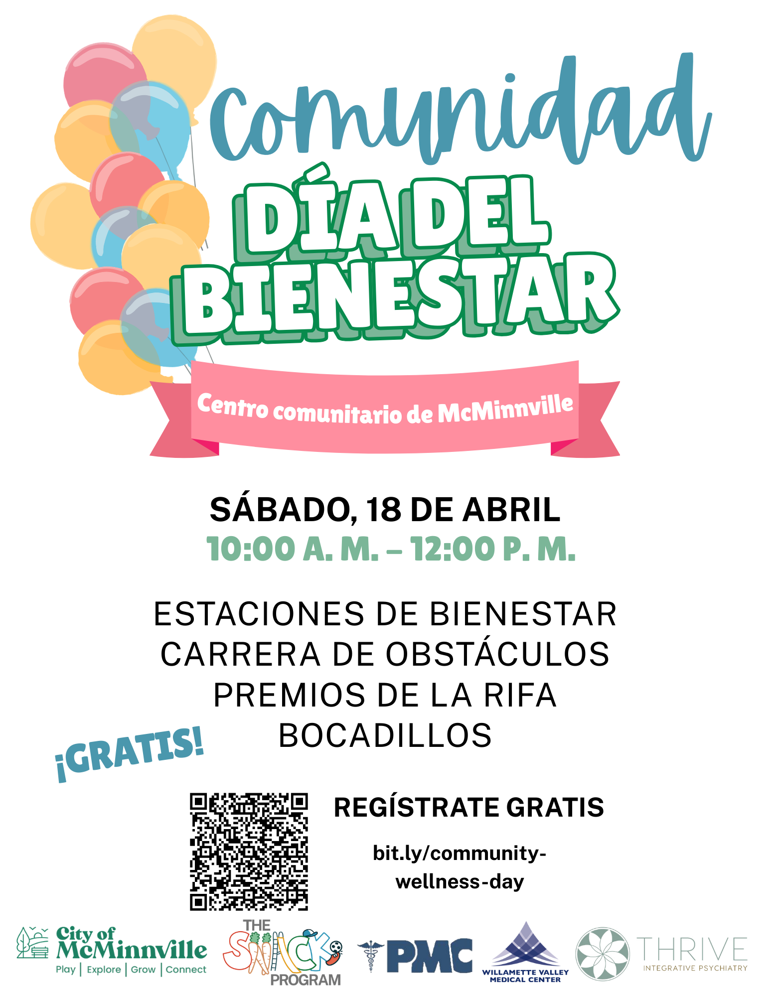 El Programa de SNACK y McMinnville Parks & Recreation se complacen en organizar el Día del Bienestar el sábado 18 de abril, de 10am-12pm, en el Centro Comunitario de McMinnville.